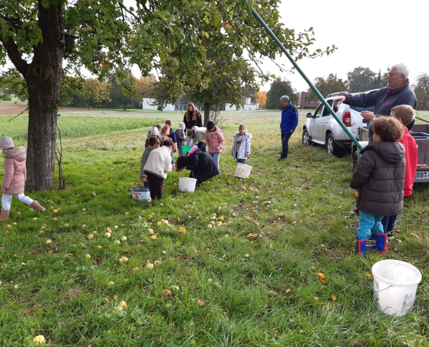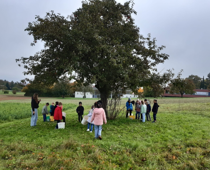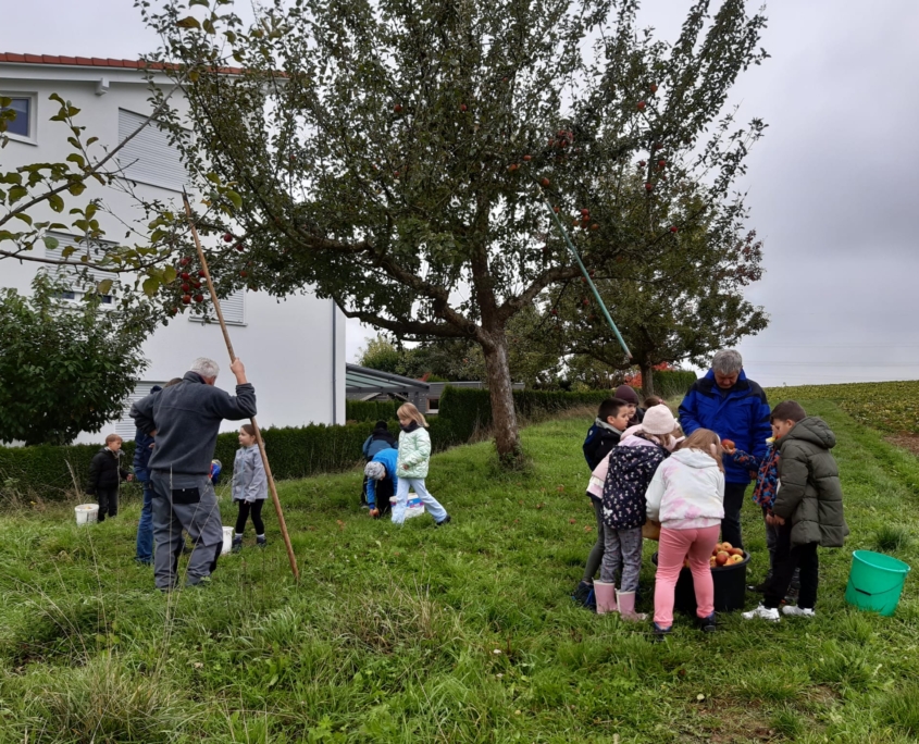 Bei der zweiten Aktion einige Tage später konnten dann die Drittklässler praktische Erfahrungen sammeln. Gemeinsam mit drei engagierten OGV-Ausschussmitgliedern lasen sie auf der Schulwiese und im Gewann Guldenäcker jede Menge Äpfel auf. Diese werden bei der Mosterei Lohrer zu leckerem Apfelsaft verpackt und der Schule in praktischen 5-Liter-Bag-in-Box-Kisten zur Verfügung gestellt.
