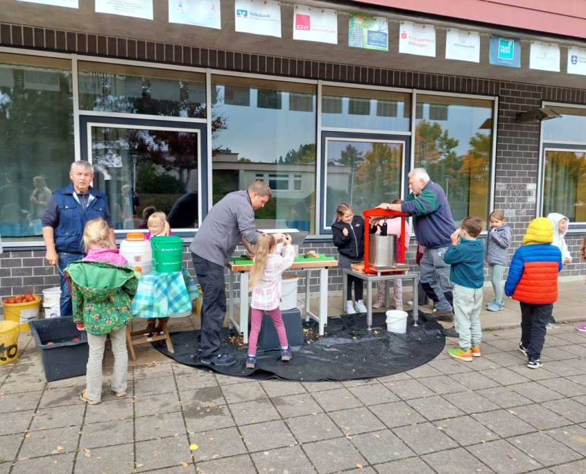 /in NewsmeldungenSo lud der Verein die frisch eingeschulten Erstklässler zum gemeinsamen Saftpressen ein. Mit der 2023 angeschafften mobilen Saftpresse konnten die Kinder sebst erleben, wie aus frisch geernteten Äpfeln frischer, süßer Saft wird. Der durfte natürlich gleich verkostet werden, was bei den kleinen Streuobstfans verständlicherweise äußerst gut ankam.